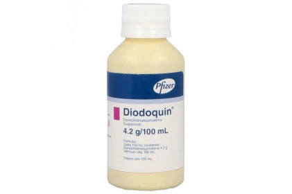 DIODOQUIN Oral Suspension contains 4.2 grams of Iodoquinol per 100 mL and is used to treat intestinal infections caused by Entamoeba histolytica (amoebiasis) and other protozoal infections. This 120 mL suspension provides an effective and easy-to-administer treatment, especially for patients who have difficulty swallowing tablets.