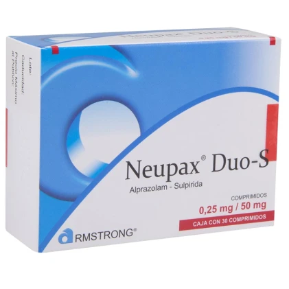Neupax Duo-S is a combination medicine containing two active ingredients: alprazolam and sulpiride. Alprazolam is a benzodiazepine that has anxiolytic properties. Sulpiride is a dopamine receptor antagonist that is commonly used to treat psychiatric disorders. Neupax Duo combines these two active ingredients to treat various conditions, such as anxiety disorders.